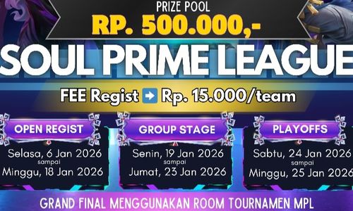 TournamentSOUL PRIME LEAGUE S3●Pendaftaran DibukaGratis18 Jan 2026Slot0/32PenyelenggaraSoul Predator Organizer
